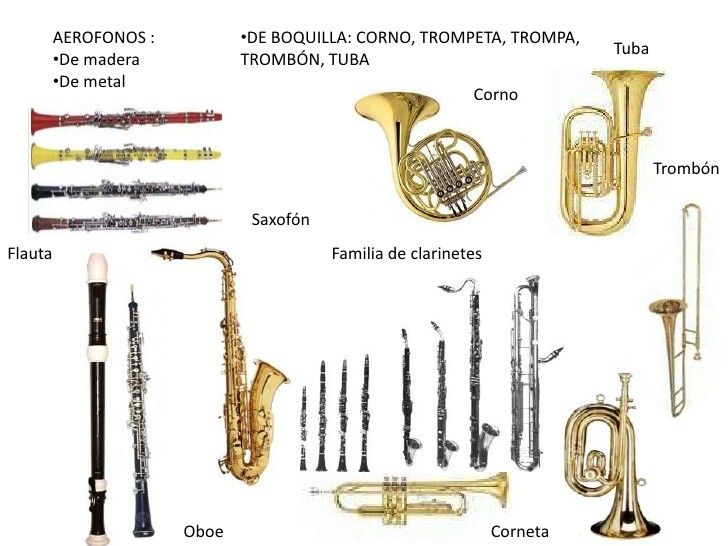 Los instrumentos de viento o aerófonos son una familia de instrumentos musicales los cuales producen el sonido por la vibración del contenido de aire en su interior, sin necesidad de cuerdas o membranas porque solo requiere de la vibración del aire. Los aerófonos de metal producen un sonido de timbre fuerte. En este caso, el músico hace vibrar sus labios en una boquilla que genera la frecuencia acústica. Entre los aerófonos de metal podemos nombrar a la trompeta, la tuba y el trombón, entre otros.