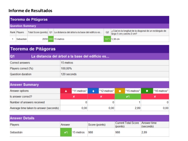 Una vez finalizado el kahoot el profesor(a) puede obtener los resultados de los estudiantes y determinar cuáles son las carencias en el tema abordado en el juego.